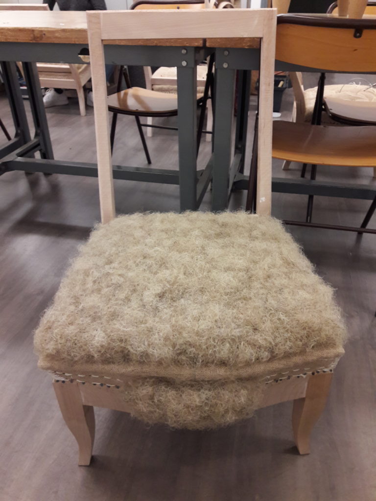 On approche de la fin de la réfection avec la pose du tissu. On place au préalable de la ouate afin d’apporter du moelleux à l’assise.